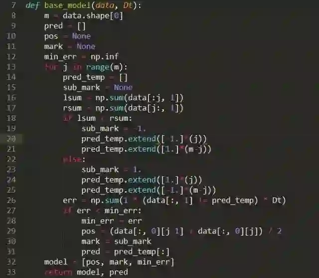 定义基础模型:其中,data就是输入的训练数据,Dt则是第t个基础模型对应的训练样本的权重。这里定义的基础模型非常简单,即找到一个阈值,以该阈值为分类边界进行分类。