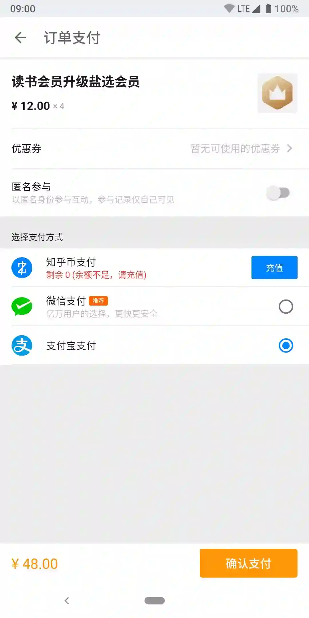 如果想将「读书会员」升级为「盐选会员」也是可以的,但需要填补一定的差价,即每月 12 元。