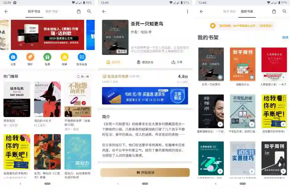 知乎的「书店」虽然入场比较晚,但其中提供的书目还算颇具规模;而在这些书中,「盐选会员」能享受其中 10000+ 本的免费借阅资格。支持会员免费的书籍,会直接显示「开始阅读」按钮,并且支持下载到本地以离线阅读。
