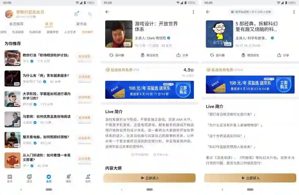 简单来说,「读书会员」仍然可以享受一部分书籍的免费阅读资格,但比起「盐选」的阵容要少很多;Live 限定为只有 12 场「阅读相关」的可以免费参与,「讲书」则可以免费畅听。