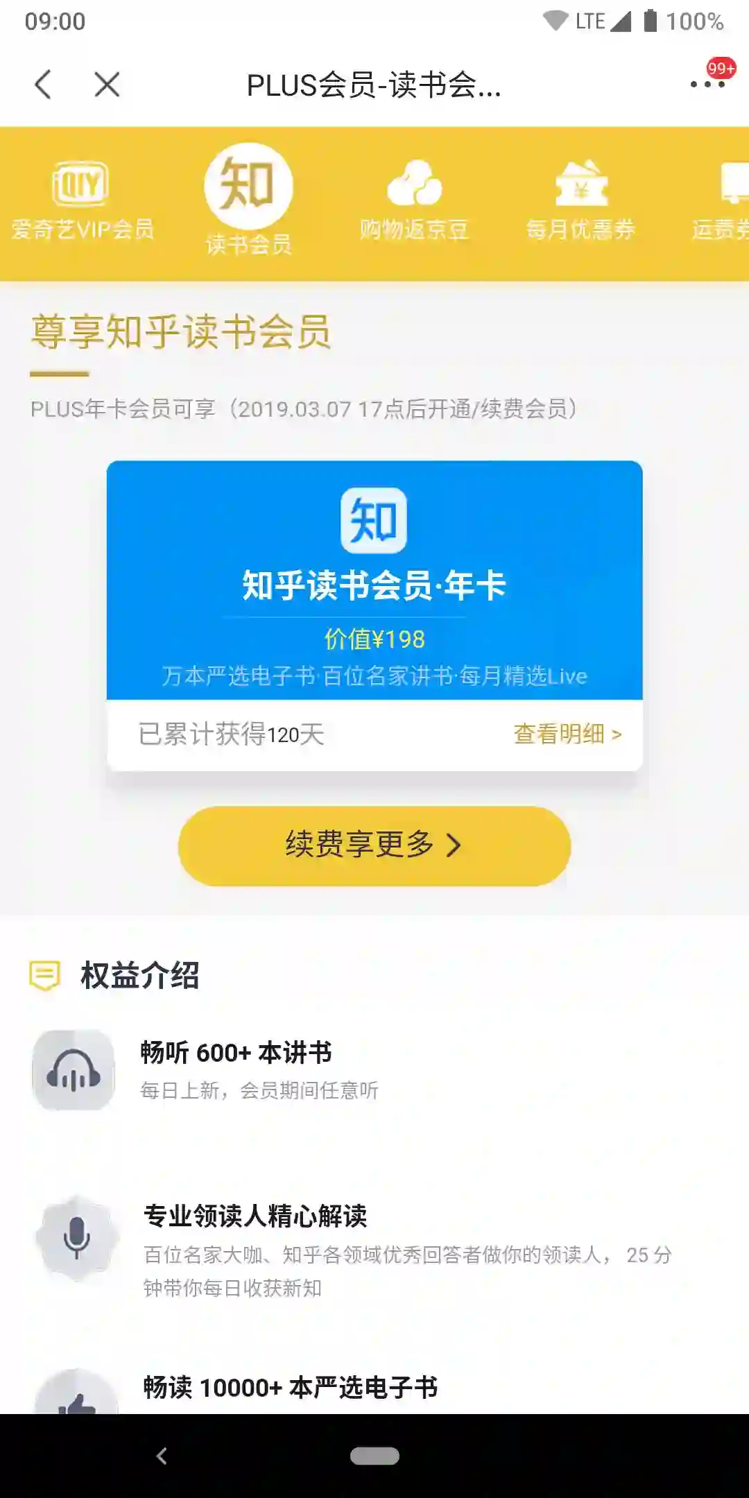 如果你在 3 月初续费过京东 PLUS,或者已经是老会员之一,你或许会注意到 PLUS 权益中多出了一个「价值 198/年」的「知乎读书会员」。其中 3 月 7 日后购买或续费可以直接享受,而老会员则可以通过抽奖的方式,获得与剩余期限等长的「读书会员」。