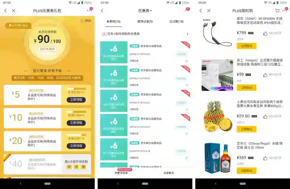 这两大会员服务对应的主要权益,应该已经有不少读者了解了。PLUS 会员可以领到专属的优惠券,其中包括每月 100 元的全品类优惠券;运费可抵扣(每月 5 张),购物返 10 倍京豆,同时还有一部分「京东精选」商品提供会员专享价。