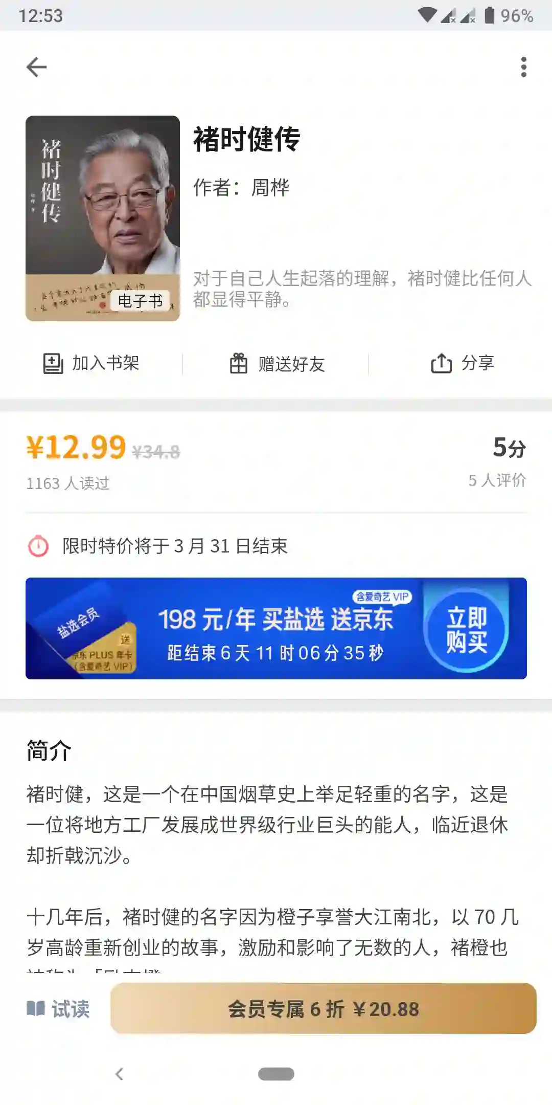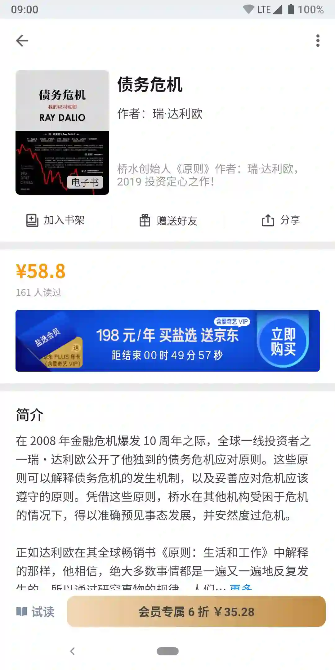 不支持会员免费的书籍,也可以选择以六折的优惠价购买;目前来看,这一优惠应该涵盖了所有书目,我简单查阅了一部分付费榜单中的书籍,基本上都支持免费阅读或 6 折购买。