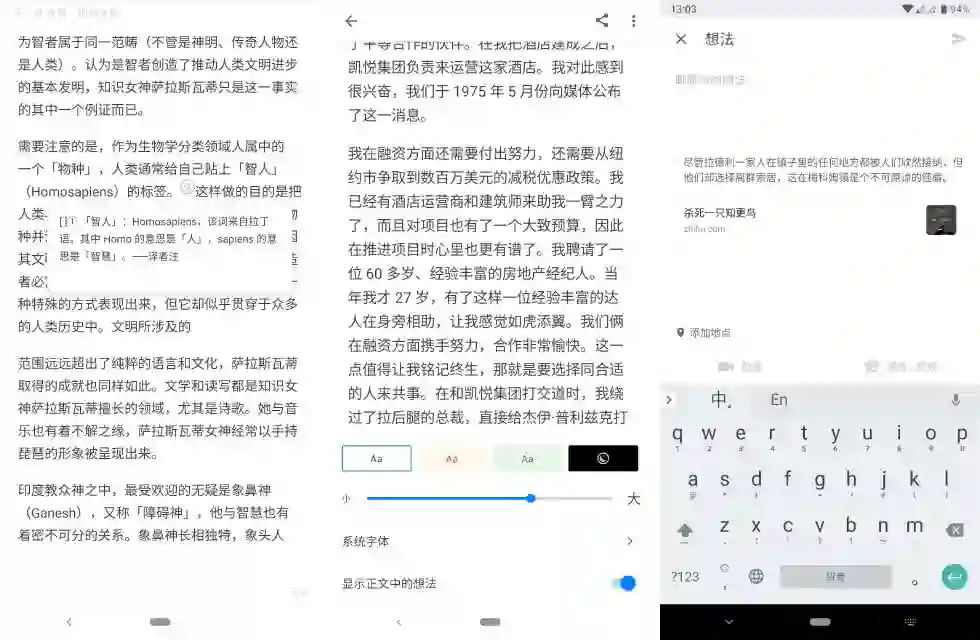 在阅读体验上,知乎 App 提供的阅读器功能较为基础,只提供了背景颜色更换、字体大小调节的功能。既不支持边距和行间距调节,也没有传统意义上的笔记,只可以添加「想法」;不过,添加的「想法」会被直接分享到知乎站内,同时阅读这本书的人也会看到。