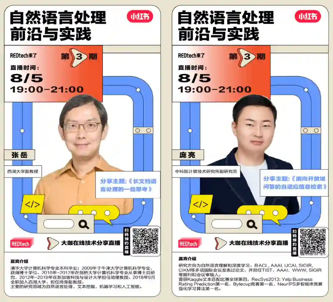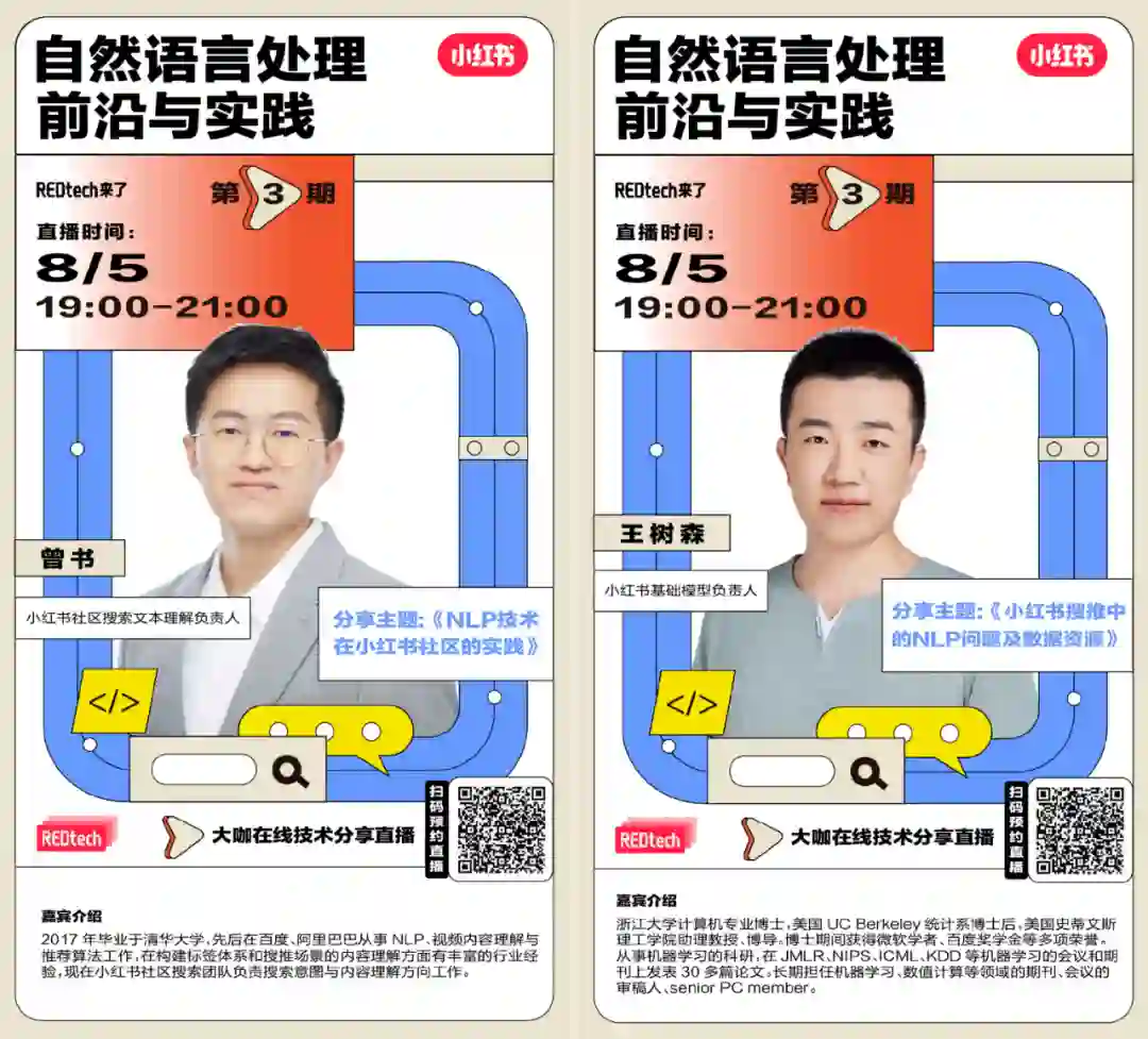 除了张岳、庞亮两位学界大牛的分享干货满满之外,小红书社区搜索文本理解负责人曾书和小红书技术模型负责人王树森分享的小红书所面临的 NLP 问题和实践将会是第一手的工业界案例分享,同样不容错过。