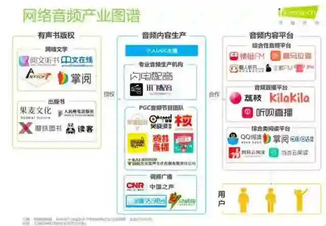 这也是目前音频市场较为主流的几种内容形式。目前来看,在线音频内容主要包含音频节目(也可称播客,指可任意下载并随身收听的网络广播节目)、有声书(包括广播剧)、音频直播和实时播放的网络电台四种内容。
