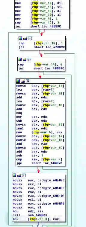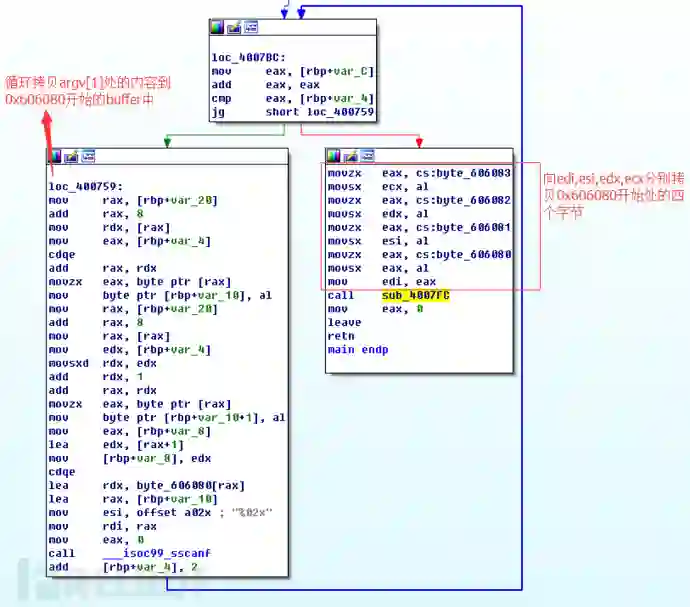 拿到一个二进制程序,首先需要分析一下它的逻辑,所以首先将sample_1二进制文件扔到IDA pro中,分析它的逻辑。在IDA中可以看到它首先分析argc的个数是否大于1,如果小于等于1则直接退出。否则,就将argv[1]的内容拷贝到以0×606080开始的全局数组中,然后将0×606080,0×606081,0×606082,0×606083这三个地址处存放的字节存入到edi,esi,edx,ecx四个寄存器中,然后调用 sub_4007fc处定义的函数。