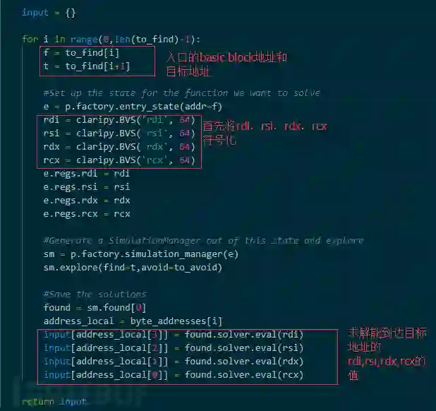在收集了要分析的每个sub function的入口basic block,目的basic block和avoid basic block之后,就可以使用angr的动态符号执行分析工具来求解满足每个sub function的输入值(此时的输入时edi,esi,edx,ecx)。