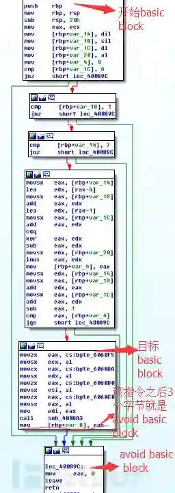 由于每个sub function的结构都是一致的:首先判断edi,esi,edx,ecx存储的数据是否满足它的各种逻辑判断,其中edi,esi,edx,ecx里面的数据是从0×606080处开始的buffer中随机选的4个字节,所以可以通过利用angr,将edi,esi,edx,ecx作为符号输入,从每个sub function的入口basic block开始,到达目的basic block处(满足各种逻辑判断),为了加快angr的求解速度,可以指定angr不需要走的路径,下图是其中的一个sub function的开始basic block,目的basic block和避免的basic block。