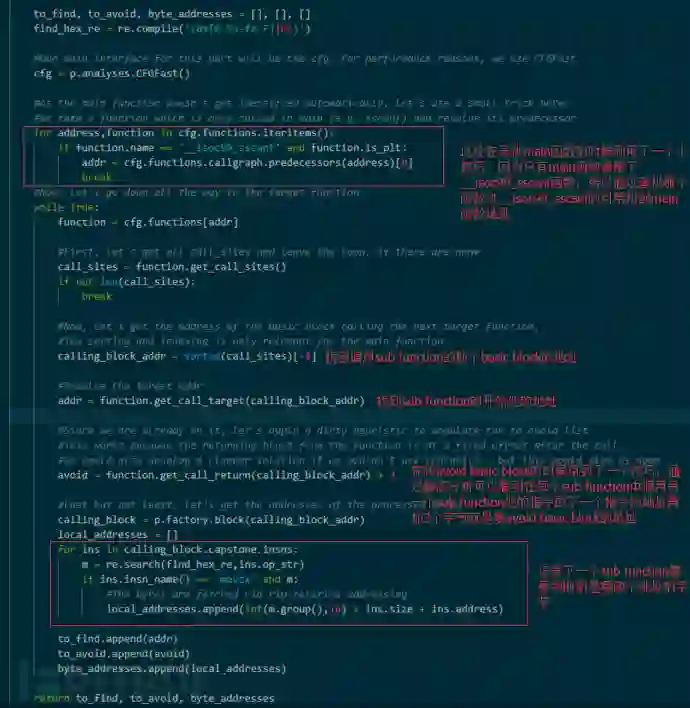 先通过angr的静态分析功能得到每个sub function所需要的分析的开始basic block,目的basic block和避免走的basic block,以及该sub function所需要判断的是从0×606080处开始的buffer中的哪四个字节。