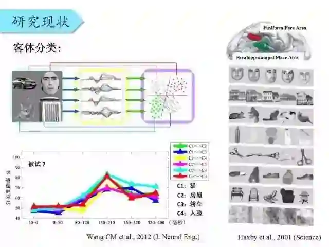 2001年Haxby在Science上发表了一部分工作,通过fMRI实验,他将颞叶皮层的激活模式作为特征,对客体进行分类识别,在一些物体上达到了90%以上的分类准确率。后来有人在脑电上进行了类似的分类工作。
