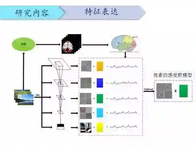 我们利用CNN对图像进行分解,得到不同层次的特征,然后观察不同层次特征和大脑体素信号的对应关系,由此可以建立体素的感受野模型,相当于特征在大脑皮层上的一个表达。