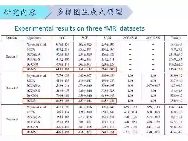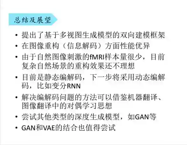 最后,对我们的工作进行一个总结。我们提出了一个基于多视图生成模型的重建框架,这个框架具有很好的扩展性,它可以挖掘不同模式之间的共同表征并建立两者之间的关系,这样使得Mind Reading成为可能。我们还研究了深度特征在大脑皮层上的表达,但是现在的研究还存在一些局限性,比如自然图像刺激的fMRI样本量很少,所以目前只能在数字、字母、符号上有较好的重建效果,对自然图像的重建效果还有待研究。而且,目前采用的是静态编解码,下一步将采用动态编解码,比如利用RNN,LSTM。此外,我们认为解决编解码问题的方法可以借鉴机器翻译中的对偶学习思想。值得一提的是,将VAE和GAN结合也值得尝试。