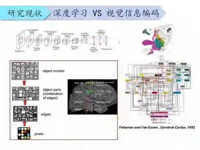 研究发现,深度学习的层级特征和大脑皮层之间有一定的对应关系。比如,低层的Gabor滤波器类似于V1区识别图像中像素级别的局部特征,例如边缘信息;高级区域将低级特征组合成全局特征,形成复杂模式,甚至语义级别的信息。而对于中间层的映射关系,还有待进一步研究。