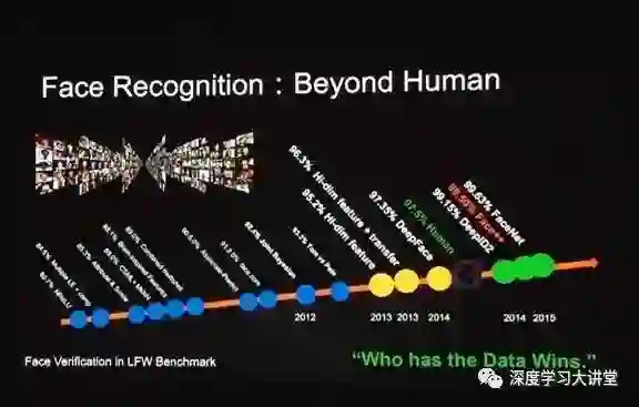 人脸识别进展非常快,上图所示是2013年我在微软的团队做的一个叫高维特征的工作,在著名的公开评测集LFW上的效果非常好,但在当时与人类识别性能还是有差距的。在2014年,Facebook的作者杨明等第一次很有效地用深度学习系统来做人脸识别工作,他们的结果非常接近人类识别性能。后来,大家快速地使用深度学习,并用更大量的数据,在这个数轴上,可以看出,大家(包括我们Face++)的结果都可以超过人类的性能。