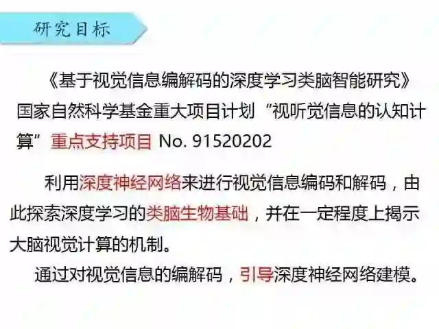 我们拿到了一个国家自然科学基金重点支持项目“视听觉信息的认知计算“,利用深度神经网络来进行视觉信息编码和解码,由此探索深度学习的类脑生物基础,并在一定程度上解释大脑视觉计算的机制。通过对视觉信息的编解码,引导深度神经网络建模。