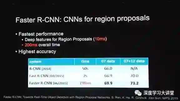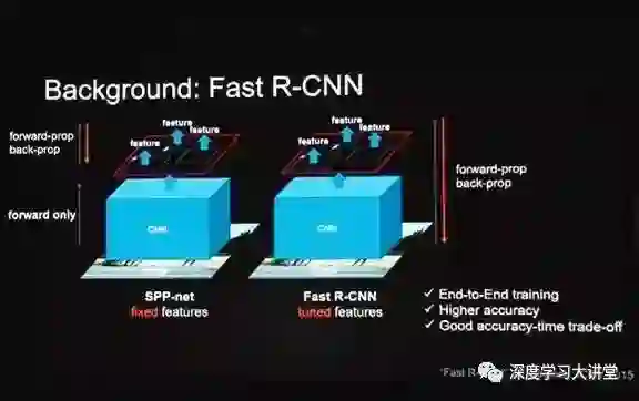 有了SPP-net后,Ross自己写了一篇论文——Fast R-CNN。因为他发现SPP-net前向的一部分是不finetune的,只有最后一段是finetune的,他就把整个放到SPP-net上,同时把前面的feature也finetune了,这就形成了叫做Fast R-CNN,结果非常好。可见,端到端学习在深度学习系统中有多重要。