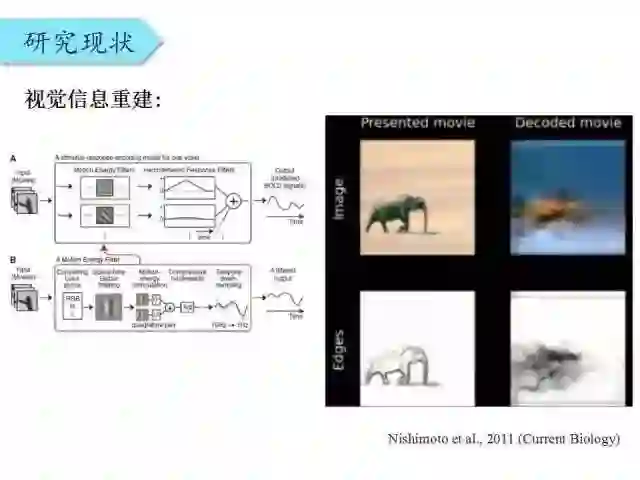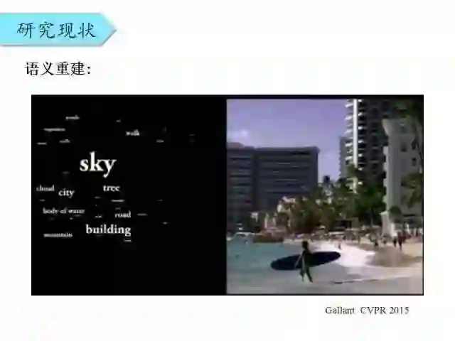这是Gallant(神经科学家)在CVPR15上介绍的一个语义重建工作,Gallant是神经科学家,但是却受邀在CVPR上做KeyNote,这也反映了计算机视觉有必要与神经科学加以结合。受试者观看一个视频,同时采集他的fMRI信号。通过分析他的fMRI信号,就可以预测出人所看到的视频中包含的重要语义信息。