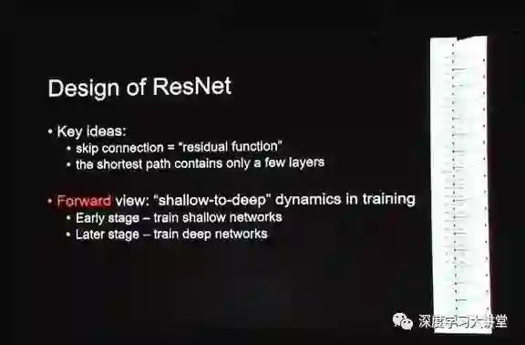 这里大概说下我们对它的解释。当然,这个后来有很多的解释,具体哪个解释更正确,这个可以讨论。我们的一个解释是,在一个ResNet的训练过程中,有一个shallow-to-deep的动态过程,在训练初期,可以认为它在训练一个浅层网络,随着训练的慢慢深入,其实它是在训练一个深层网络。