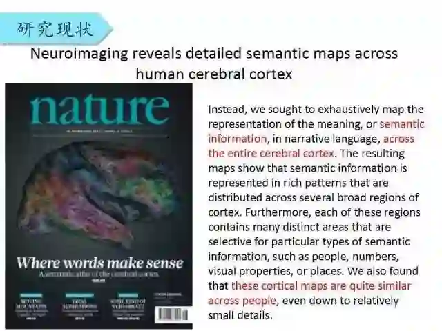 他们(Gallant组)发表在2016年Nature上的工作提出了几个重要观点:语义信息是在整个大脑皮层上都有响应的,且他们在不同个体上具有某种共性。