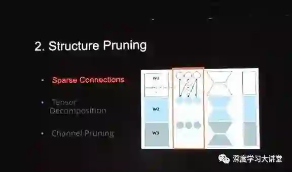 把连接幅值比较小的地方去掉。但是,这样虽然能降低网络的规模,但在运行时并不会降掉,因为这样的稀疏结构对很多设备是不友好的。
