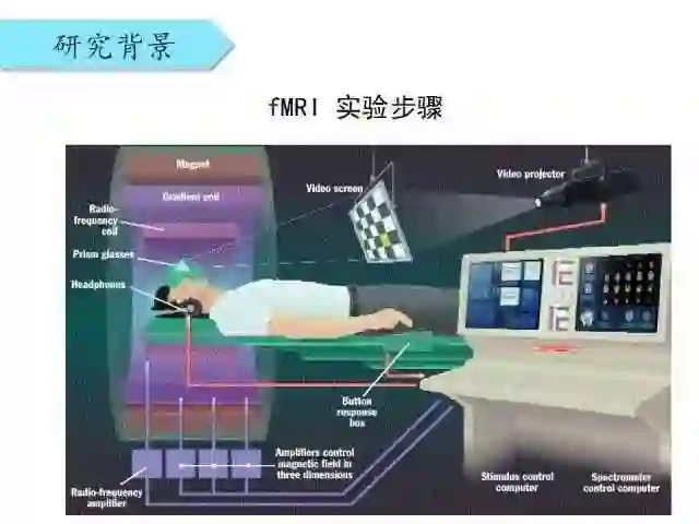 这是fMRI的一个实验步骤:人躺在共振成像的设备中,通过投影设备给他一些视觉刺激和任务,可以得到分别在静息和受刺激时的大脑反应,通过二者状态的差值能够检测出受刺激时相关的大脑反应区。