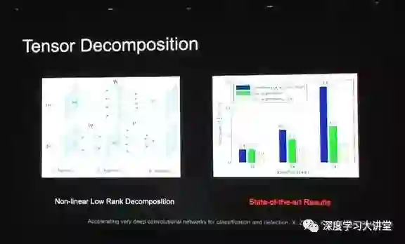 上图所示是我们以前做的一个工作,简单来说,是把一个3D的卷积用卷积核分解的方法拆成3个连续的卷积,这样每一组卷积都可以更小更快。该方法第一次在VGG上达到了4倍加速,在ImageNet上几乎不减任何性能。