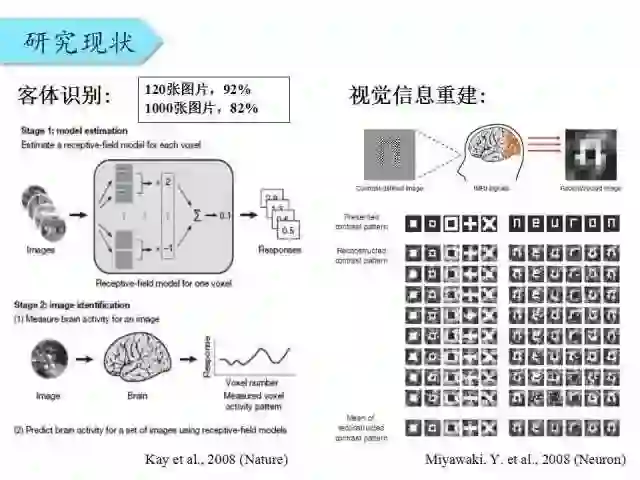 在客体识别上,UC伯克利的研究组利用Gabor金字塔建立了从图像到大脑信号的模拟V1感受野的模型。当接收到一个新的fMRI信号后,将信号和感受野模型的预测结果进行匹配,在120多张图片中可以达到90%以上的正确率。