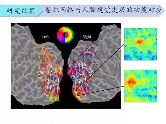 前面讲的是重建方面的工作。我们还尝试探索了深度网络与人脑视觉皮层的功能对应性。研究不同脑区和卷积层的对应关系。比如我们进行了量化的研究,上图右边是深度神经网络的第一个卷积层的感受野,由此推算出人脑视网膜的拓扑映射结构,左边是体素分布。