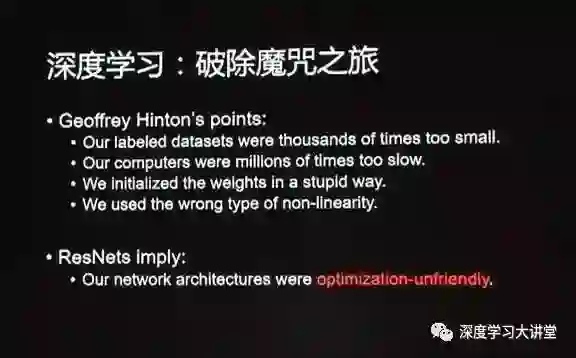 上面所示是Geoffrey Hinton的一些观点。就之前深度神经网络broke的问题,这里列了一些他的看法。我们的ResNet也有这样的一些启示,就是以前设计的网络结构其实是对优化不友好的,如果有一个对优化更友好的网络结构,是可以破除之前认为深度神经网络没有用的这样一个魔咒的。