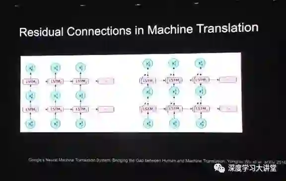 还可以将该网络很有效地应用在自然语言处理领域,比如说神经机器翻译。从以前浅层的LSTM模型切换到非常多层的LSTM模型,这个思想是通用的。