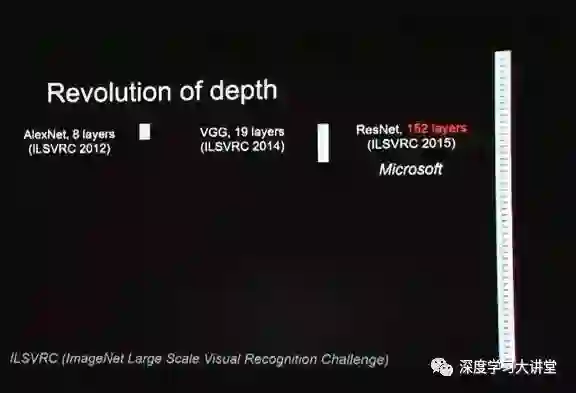 2012年,AlexNet用8层网络——这在当时已经被认为很深了,论文中专门有一段论证8层比5层好,证明深度是有用的。后来,有些人写了一些论文,试图用更浅的网络来逼近,试图来推翻这个深度有用的说法。可见,当时大家对深度是否真的有用还是存疑的。