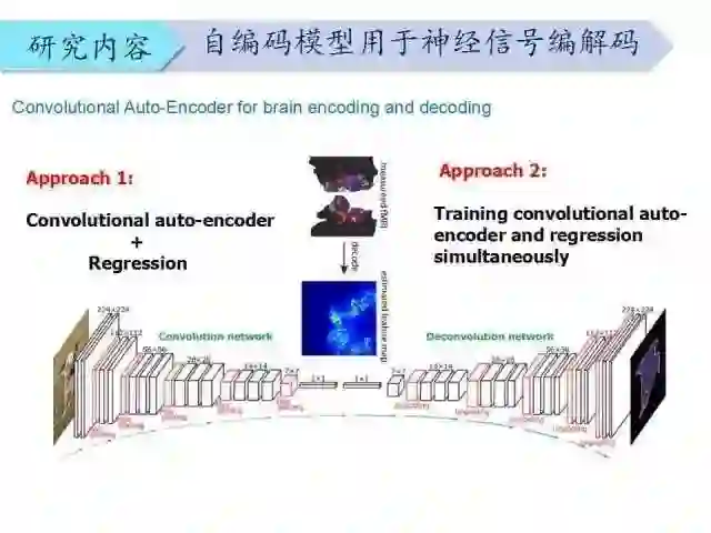 很自然地想到CNN的自编码模型,输入图像通过CNN编码,可以在中间层得到图像的特征,然后通过反卷积重建出图像。因此,如果能够建立图像特征和大脑皮层响应关系,通过皮层响应就能重建出图像。这里涉及到两种方法:第一种,先做自动编码,再把中间层和大脑信号做一个回归。第二种,将自编码和回归同时进行。