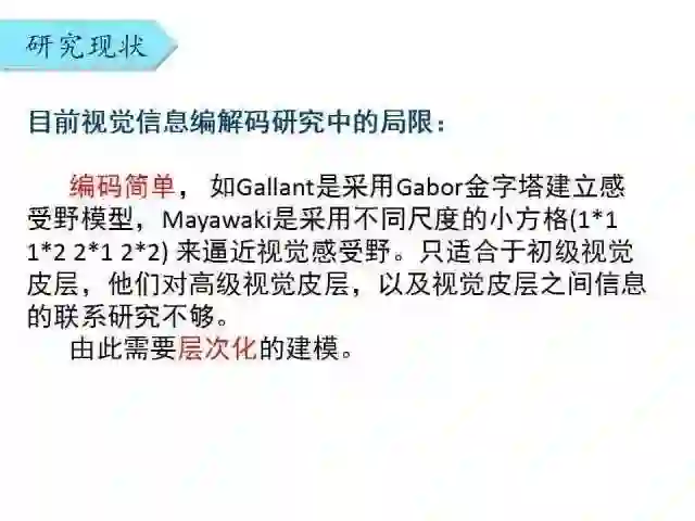 以上这些之前的研究取得了一些成绩,但是存在一定的局限性:编码较简单,如Gallant采用Gabor金字塔建立感受野模型,Mayawaki采用不同尺度的小方格来逼近视觉感受野。这只适合于初级视觉皮层,他们对高级视觉皮层,以及视觉皮层之间相关性信息的研究还不够。由此需要层次化的建模。