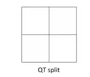 然后,在QT的叶节点可以通过二叉树或三叉树结构进一步划分。二叉树和三叉树划分可以交错并递归进行。但是,一旦应用二叉树或三叉树划分,就不允许进行四叉树的划分了。二叉树和三叉树有水平和垂直两种划分类型。对于二叉树划分,两种划分类型都是对称的。对于三叉树划分,划分的比例为1:2:1。