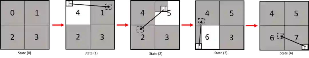 如图所示,当左边CTU完成编码时,区域0,1,2,3的重建像素将存储在IBC的内存中(状态0)。当前CTU按照4->5->6->7的顺序依次编码四个区域。IBC内存中可用于对当前块进行预测的参考像素如状态1~状态4所示,在此过程中逐步将左边CTU中的像素,更新为当前CTU中的重建像素,直到当前CTU所有区域完成编码。