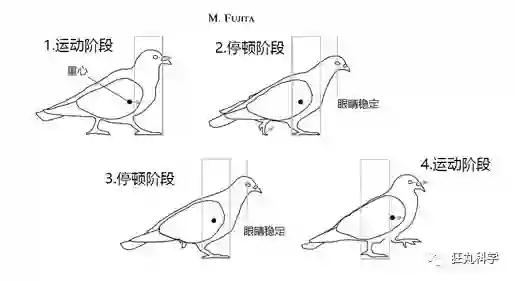 首先在双脚支撑阶段,鸽子将头部往前伸,让重心前移(阶段1)。当重心到达支撑脚上的时候,后脚立刻抬起,随后头部会停止移动(阶段2)。在单脚支撑期间,通过让眼睛和头部保持不动,鸽子能获得稳定的视野(阶段3)。最后,后脚落下变为前脚,原来的前脚成了后脚。鸽子头部再次往前伸,让重心前移(重复上面的步骤)。