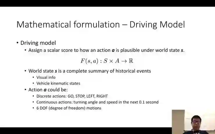 模型的数学定义如上图,评估给定的状态 s 和动作 a 的得分,其中 s 包括视觉信息和车辆的当前状态;a 可以是分离的几个状态,也可以是连续的数值输出;最精确的是输出 6 个自由度上的运动