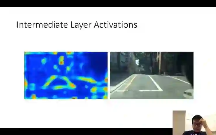 这里,为了更好地展示模型学到的特征,徐华哲从模型中抽出了 conv-4 层学到的特征。对于右侧的街道图,左侧是模型注意力的 heat-map;两图并不是完全对齐的。可以看到,行车线、红绿灯、骑车的人和汽车(表现为两个车轮)都获得了很高的注意力。