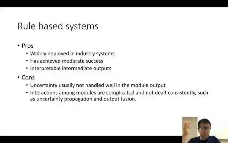 基于规则的系统,好处是在工业界得到了广泛使用,比如 GoogleX 的自动驾驶就是以基于规则的系统为主;以及系统的可解释性非常强。不好之处是难以应对不确定的情况,以及在复杂的情况下无法对所有可能的操作进行建模。