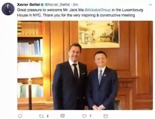9 月 20 日消息,卢森堡首相贝泰尔在个人推特上发布了一张同阿里巴巴董事局主席马云的合影,并附文称,“很高兴能够在纽约的卢森堡公馆欢迎马云,非常感谢您鼓舞人心和富有建设性的会谈”。