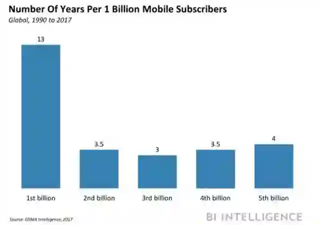 3. 但是,移动用户数量的增长速度将会放慢。全球移动用户数量达到 50 亿花费了大约四年的时间。它达到 40 亿只用了三年半时间。这意味着,它达到 60 亿可能需要更长的时间,因为新的移动用户总数是在不断萎缩的。