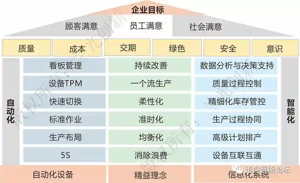该精益屋以自动化设备、信息化系统为基础,以精益思想为主线,以自働化、智能化(含数字化、网络化)为新时代的支柱,基于5S、生产布局、标准作业、设备TPM等传统精益理念,在设备互联互通、高级计划排产、大数据分析等数字化、网络化、智能化手段的支撑下,实现自动化、智能化、精益化三者的深度融合,并通过智能化手段更好地促进生产过程的均衡化、柔性化、准时化以及实现消除浪费与持续改进,从而确保企业的质量、成本、交期,构建一个客户满意、员工满意、社会满意、充满活力与竞争力的智能化、精益化企业。