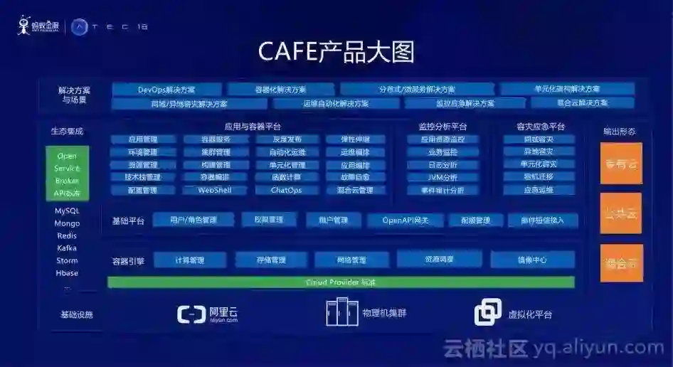 CAFE 即 Cloud Application Fabric Engine,它是理念以及产品集合,包括“两个标准”,即云 Provider 标准、Open Service Broker API 标准;“三个平台”,即“应用与容器平台”(主要关注容器和应用生命周期的管理)、“监控分析平台”(主要关注 logging、trace、metrics 以及链路、事件等平台)及“容灾应灾平台”(‘三地五中心’就是由它支持);“三个形态”包括专有云、公共云及混合云;其中构建了“N 个解决方案”,包括 DevOps、容器以及分布式架构的解决方案等。