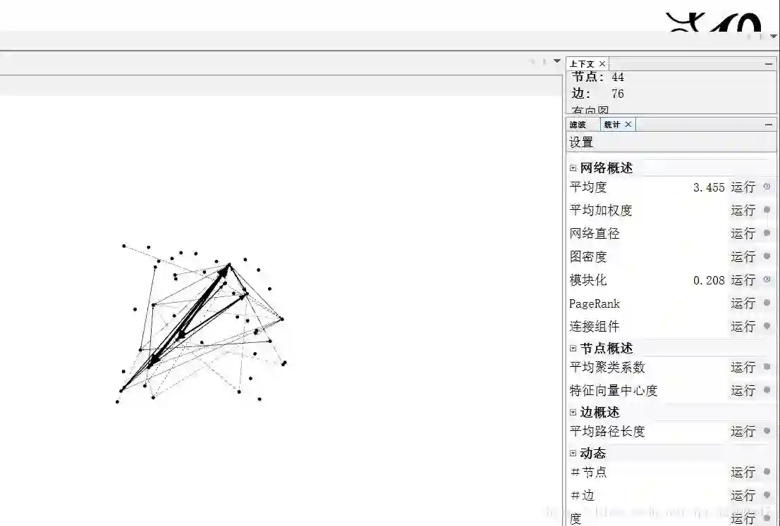 可以在最上方的数据资料选项卡中查看图中所有的边和节点,对于分词不准确导致的噪音可以手动删除。分别点击右侧统计栏中平均度和模块化运行计算。模块化运算时Resolution值填写0.5。
