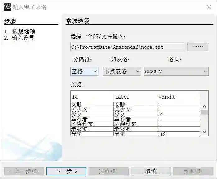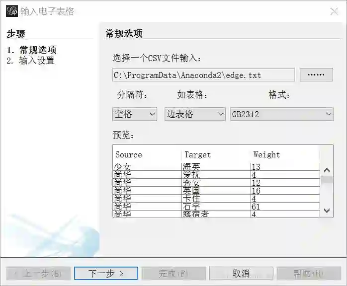 下面使用gephi这个软件来将人物关系可视化。启动gephi,分别选择节点表格和边表格导入上面代码中生成的两个文件,分隔符选择空格,编码选择GB2312。