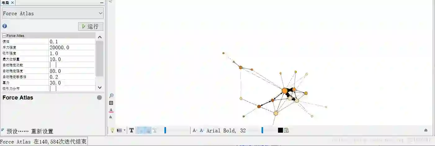 选择左下角布局中的Force Atlas,斥力强度填写20000.0,吸引强度填写 1.0。点击运行,稍后点击停止。
