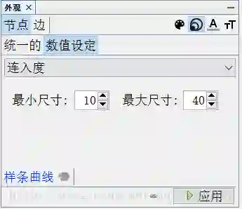 点击左上角外观中节点第二个选项卡,选择数值设定,选择连入度,最小尺寸填10,最大尺寸填40,点击应用。