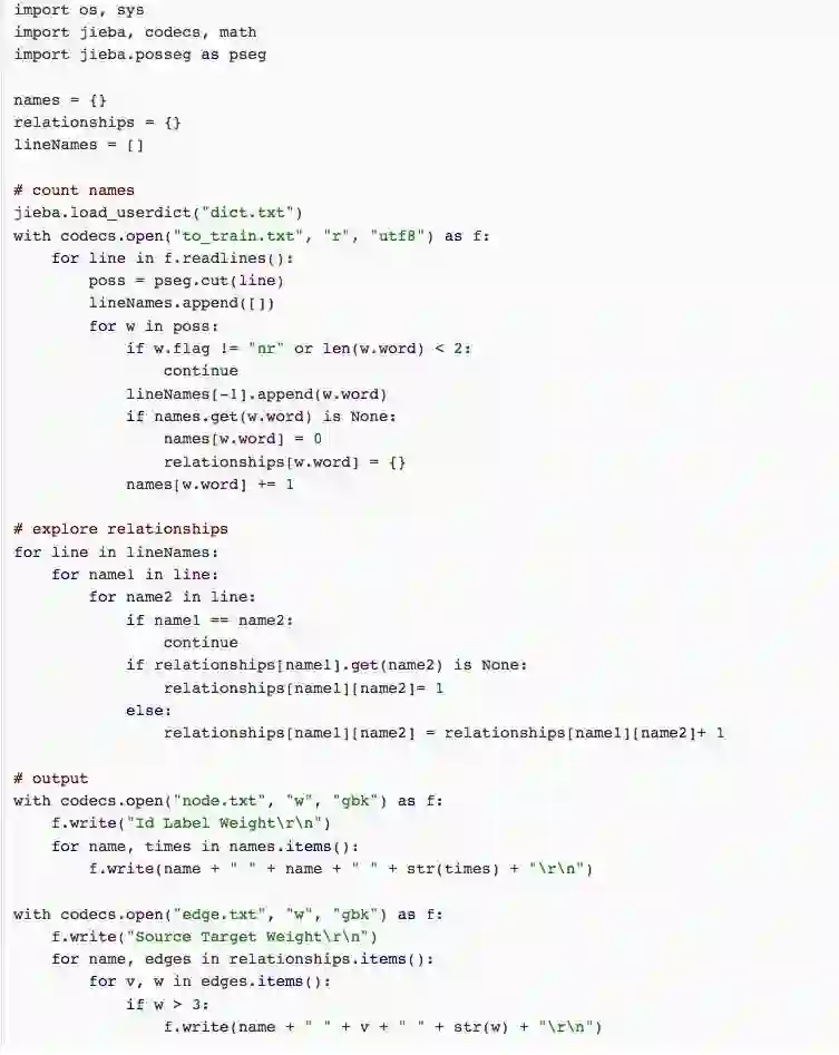 字典类型names保存人物,该字典的键为人物名称,值为该人物在全文中出现的次数。字典类型relationships保存人物关系的有向边,该字典的键为有向边的起点,值为一个字典edge,edge的键是有向边的终点,值是有向边的权值,代表两个人物之间联系的紧密程度。lineNames是一个缓存变量,保存对每一段分词得到当前段中出现的人物名称,lineNames[i]是一个列表,列表中存储第i段中出现过的人物。
