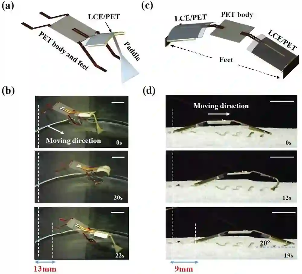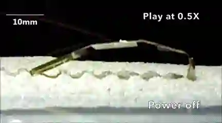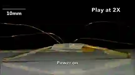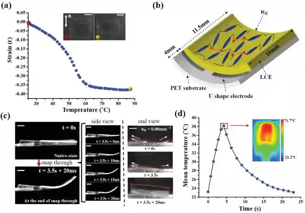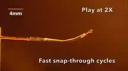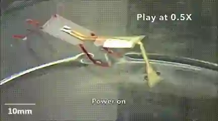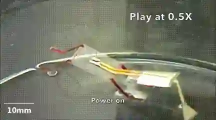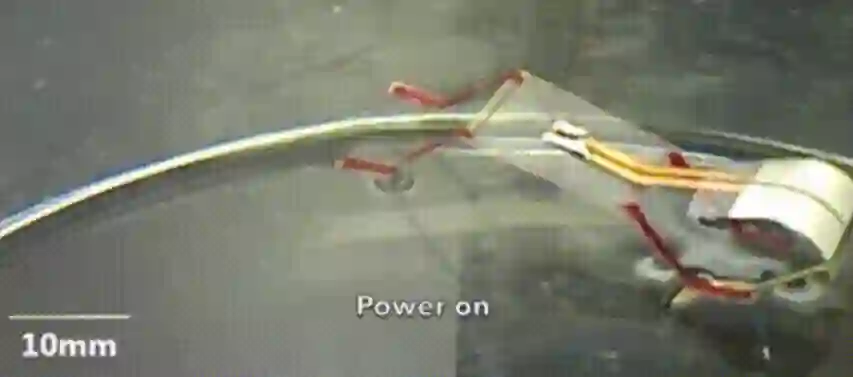 将液晶聚合物肌肉与与弯曲的聚对苯二甲酸乙二醇酯 (PET) 薄膜组合,聚合物相当于肌肉,薄膜相当于弹簧,再封装一个微型电极提供焦耳热,仅需不到几伏的电激活,关闭电源即可自动复位。